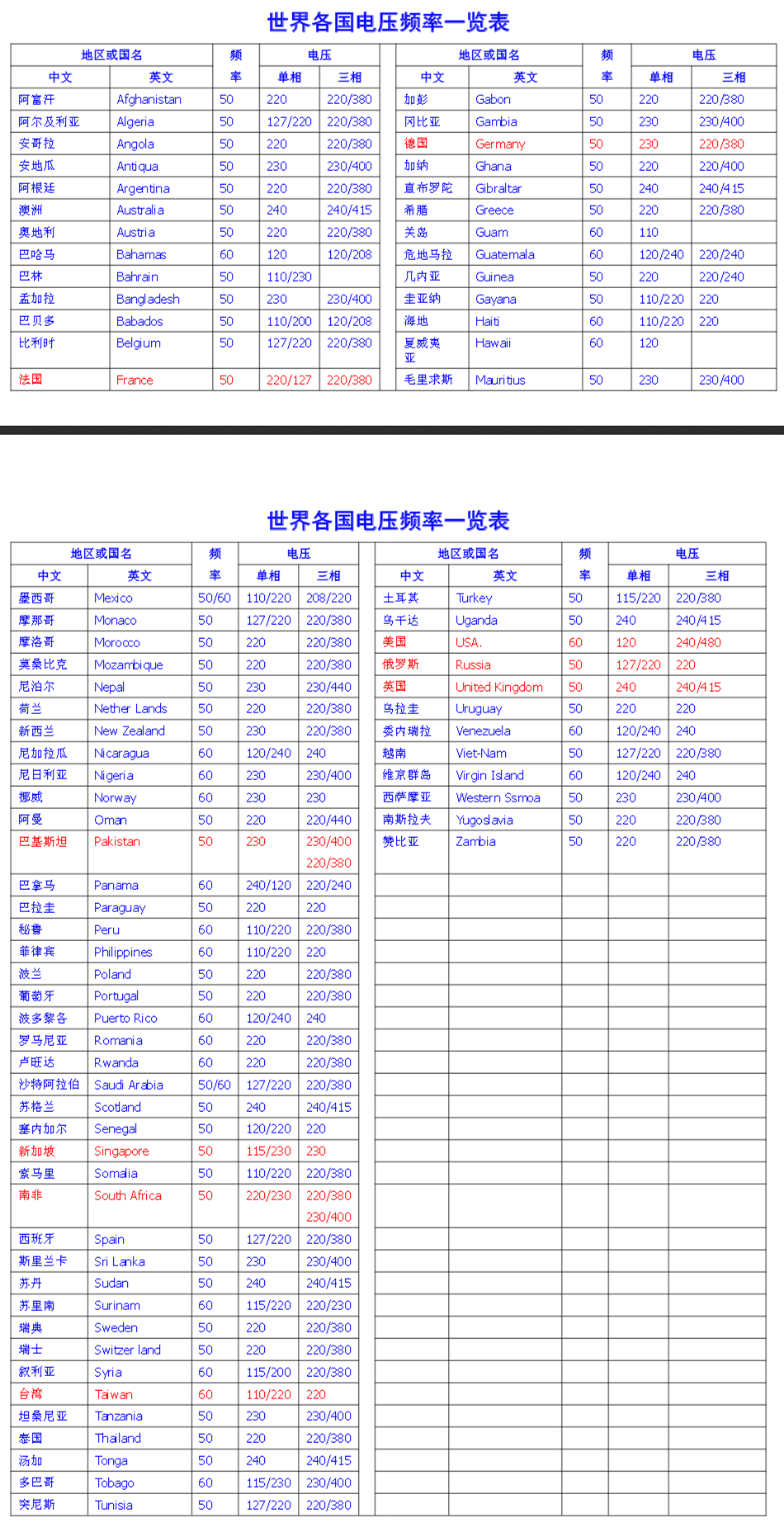 世界各國工業(yè)與民用冷水機(jī)組電源的電壓與頻率表
